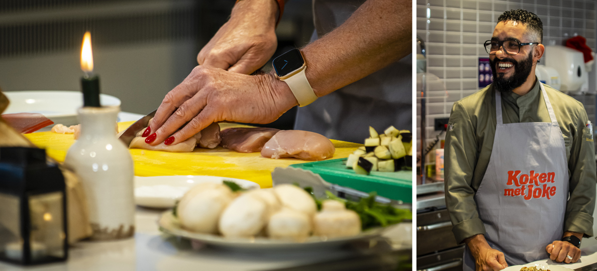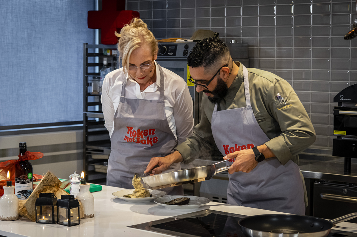 Joke krijgt als eerste opdracht om de mooiste aubergine uit te zoeken. Die wordt in plakken gesneden en vervolgens ingekerfd en besprenkeld met zout. “Ik ben oprecht verliefd op eten,” merkt Mounir met een brede glimlach op. “Dat is niet aan je figuur te zien,” complimenteert Joke hem. Mounir: “Ik train ook zo’n acht keer per week, voornamelijk fitness en soms vechtsport. Als ondernemer heb ik de luxe om mijn eigen tijd in te delen, dus ik train vaak ’s ochtends voor ik aan het werk ga - en soms ’s avonds nog een keer.”