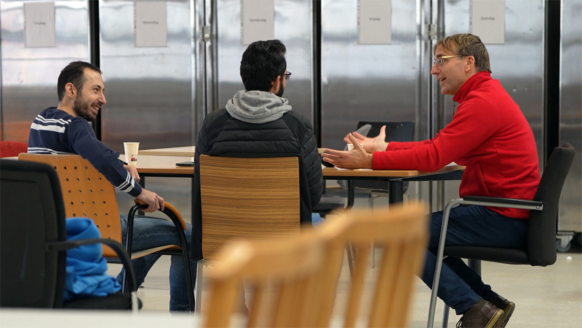 Vervolgens gaat Derk in gesprek met Amer en Hosen uit Syrië. Amer woont ongeveer 15 maanden in Almere. Hij is tweeënhalf jaar geleden gevlucht uit Aleppo. Inmiddels is hij anderhalf jaar in Nederland en wacht hij op zijn officiële papieren, zodat hij kan werken en een nieuw leven kan opbouwen. Het wachten is frustrerend, geeft Amer aan. “We doen helemaal niets hier. Je verliest het doel in je leven. Ik heb een master in Textieltechniek. Ik hoop in Nederland verder te kunnen studeren en te promoveren. Daarnaast droom ik ervan om mijn familie hiernaartoe te halen en een normaal leven te leiden.”