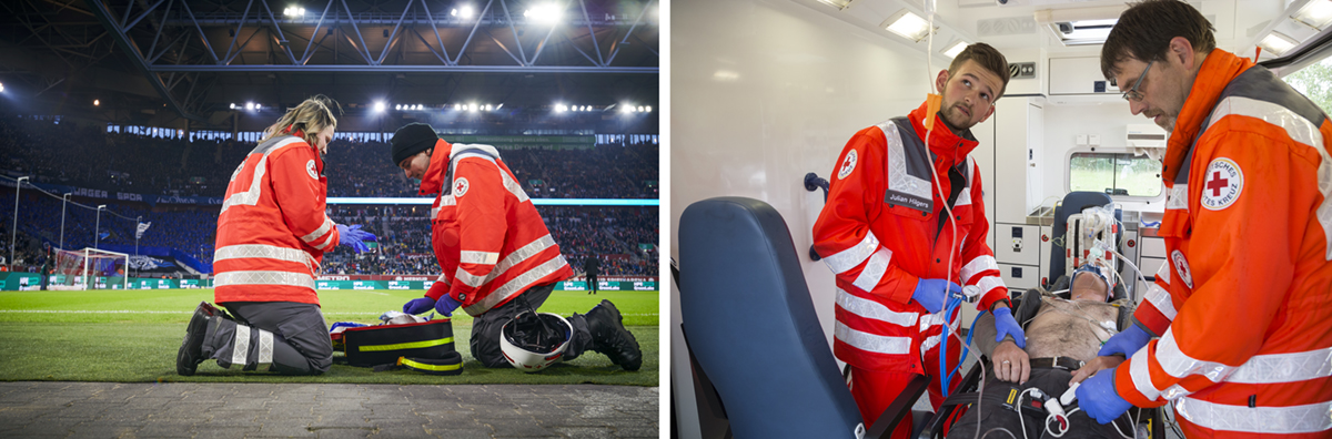 “We leveren voor het evenement alle medische en paramedische diensten, in de stadions, trainingscentra en bij openbare trainingen. We zijn er zowel voor de supporters als de spelers. Rondom en in de stadions zijn onze vrijwilligers aanwezig: in de publieke zones, maar ook in de VIP-ruimte en langs de kant van het voetbalveld. Vrijwilligers zijn ook actief bij de voorbereidingsdagen voor de wedstrijden, openbare trainingen, evenementen en bij de basiskampen van de verschillende nationale teams. Een basiskamp bestaat uit een groot hotel met een voetbalveld in de buurt. De teams zijn gestationeerd in dorpen verspreid over heel Duitsland. Voor hen moeten we heel flexibel zijn. Het kan gebeuren dat de trainer zegt: ‘Ik wil over 20 minuten trainen in plaats van op de afgesproken tijd’. Dan moeten we paraat staan. We verlenen EHBO bij de basiskampen en tijdens de evenementen naast de voetbalwedstrijden.”