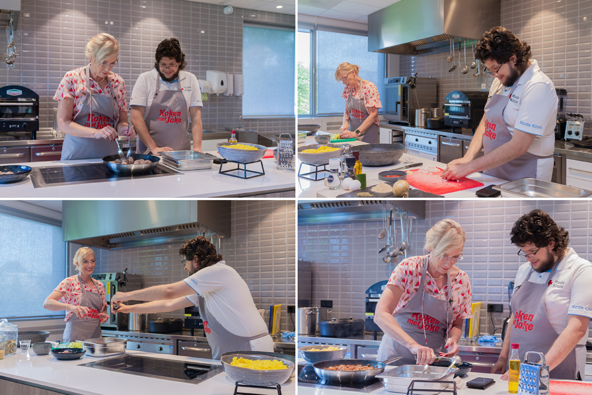 Timmy kijkt op zijn telefoon om het recept te lezen en vertelt hardop welke stappen nog gezet moeten worden. Het is tijd om het gehakt te bereiden. Op de vraag wat hem zo aanspreekt in het Rode Kruis antwoordt Timmy zonder ook maar een seconde na te denken: “Het helpen van mensen, voor anderen klaarstaan en eigenlijk ook voor iédereen klaarstaan. Daarbij is het onderling altijd goed, het is altijd gezellig. Er is een positieve sfeer.”